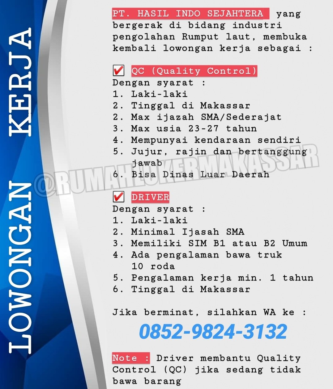 Rumah Loker Makassar Twitterissa Pt Hasil Indo Sejahtera Yang Bergerak Di Bidang Industri Pengolahan Rumput Laut Membuka Kembali Lowongan Kerja Sebagai Qc Quality Control Driver Jika Berminat Silahkan Wa